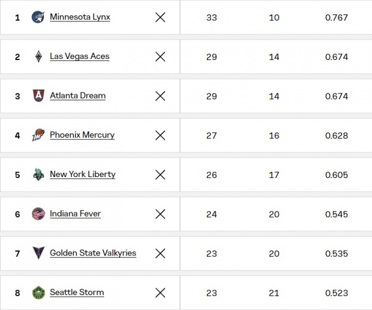 至此,本赛季WNBA季后赛八强全部产生,晋级球队包括:明尼苏达山猫、拉斯维加斯王牌、亚特兰大梦想、菲尼克斯水星、纽约自由人、印第安纳狂热、金州女武神及西雅图风暴。