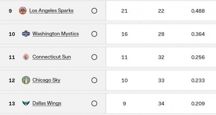洛杉矶火花、华盛顿神秘人、康涅狄格太阳、芝加哥天空和达拉斯飞翼未能获得季后赛席位。