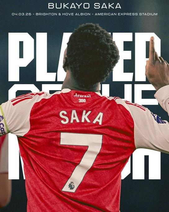 在今天凌晨进行的英超第29轮比赛中,阿森纳客场1-0击败布莱顿,赛后,打入制胜进球的萨卡被阿森纳官方评为本场比赛队内最佳球员。